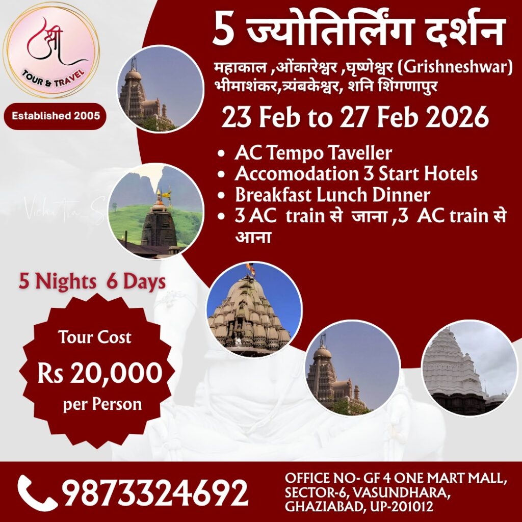 Shree Ji Tour & Travel welcomes you to embark on a deeply spiritual and sacred journey through our meticulously curated 5 Jyotirling Darshan Tour. This pilgrimage is designed for those seeking divine connection, inner peace, and spiritual enlightenment. Over a span of 5 nights and 6 days, this journey covers five of the most revered Jyotirlingas in India along with a special visit to Shani Shingnapur, offering a complete religious experience in a professionally managed and comfortable setting.